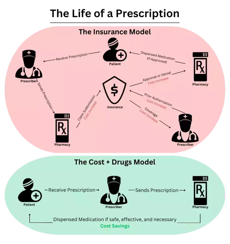 In the Insurance Model, your prescriptions are subject to the terms of your insurance plan. This often involves copayments, deductibles, and complex pricing structures. While insurance (sometimes) covers a portion of the cost, the remaining expenses can be unclear and may vary based on your plan. Additionally, the insurance model may have limitations on the selection of medications, and the pricing structure may not always be transparent.